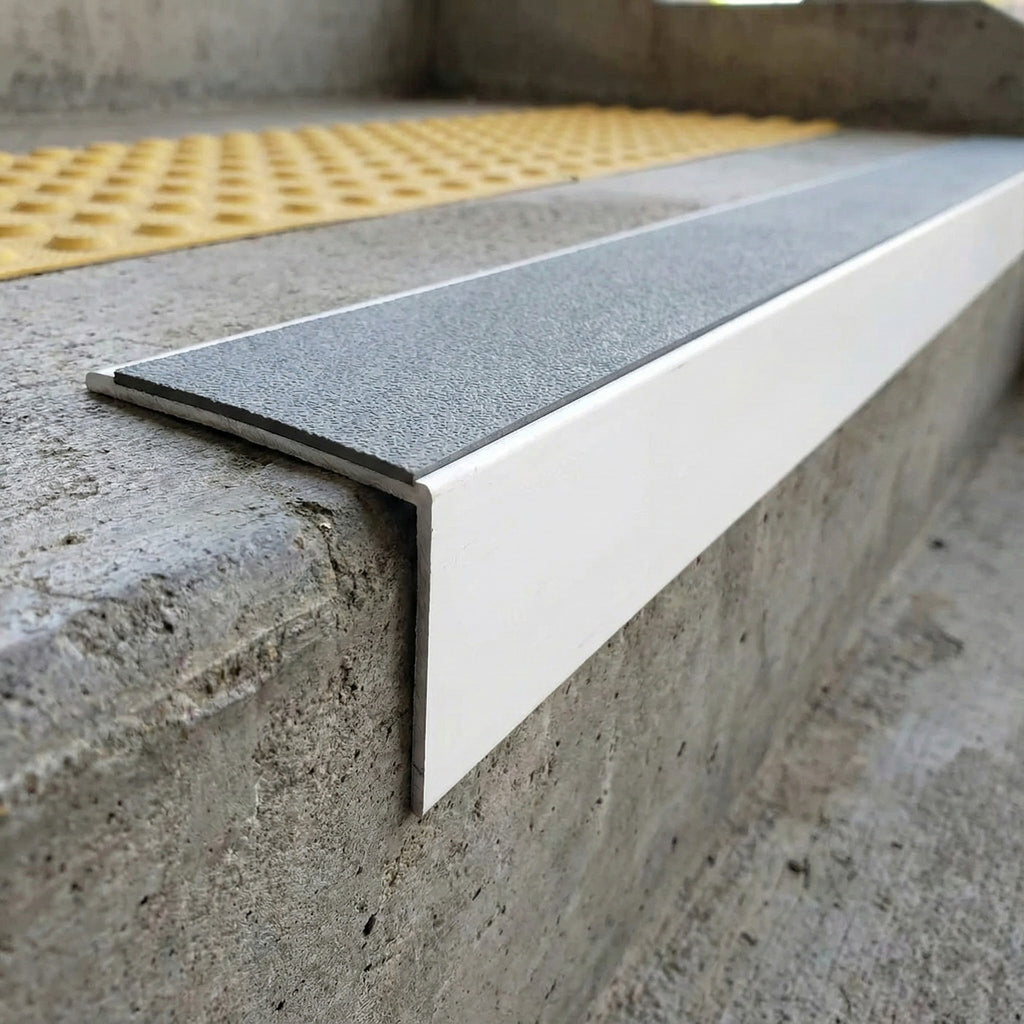 Verify that the nosing is firmly secured with no movement. Check that the PVC insert is properly seated and the profile sits flush with the stair tread. Test slip resistance and visual contrast.