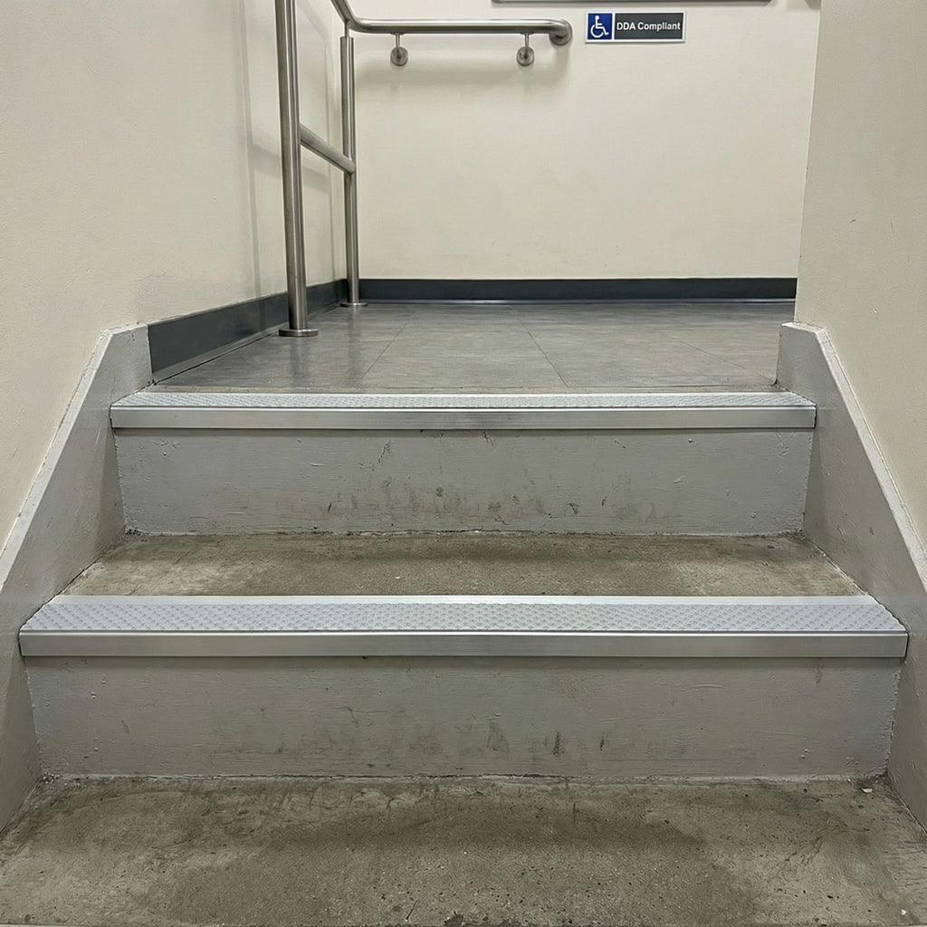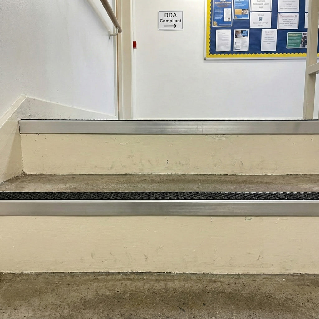 Apply protective wax coating to aluminium surfaces in high-traffic areas to reduce oxidation and maintain appearance. Ensure drainage systems prevent water pooling on stair treads. Address substrate issues promptly to prevent nosing displacement.