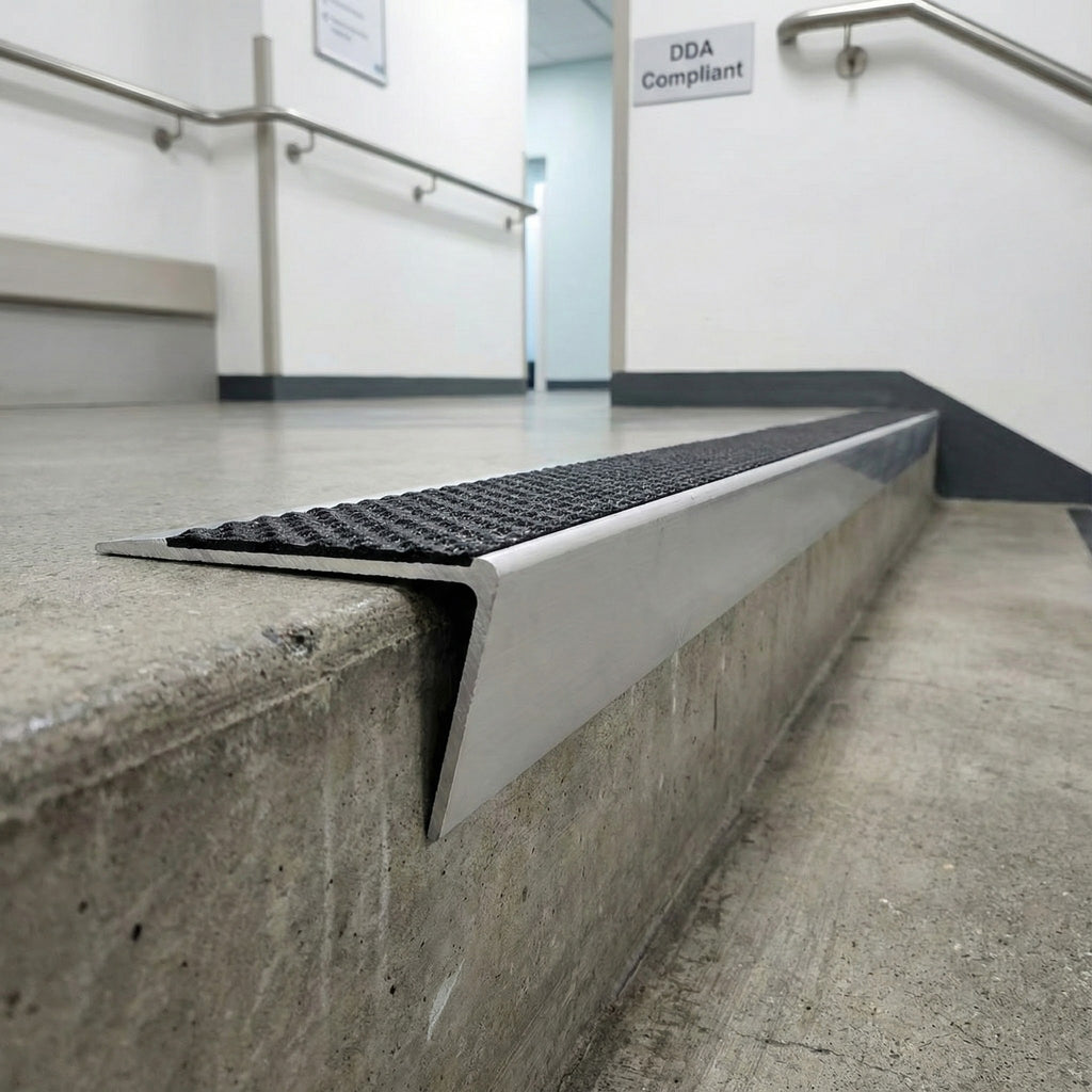 A: Absolutely. This rakeback profile meets Building Regulations Part M (Access to and use of buildings) and Part K (Protection from falling) requirements. The high-contrast PVC insert provides visual definition required under DDA provisions, whilst the rakeback design ensures wheelchair accessibility. Full compliance documentation is available upon request for building control submissions.