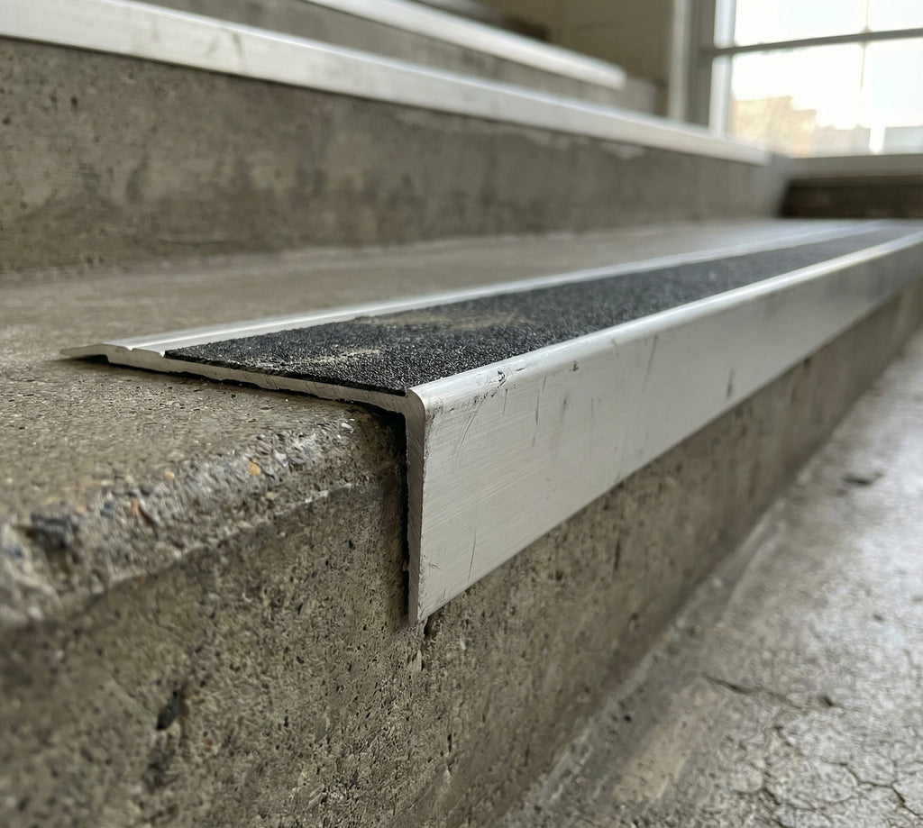 Thoroughly clean the stair tread edge, removing all dirt, grease, old adhesive, and loose material. The surface must be completely dry and structurally sound before proceeding. For concrete stairs, ensure the edge is free from spalling or damage.