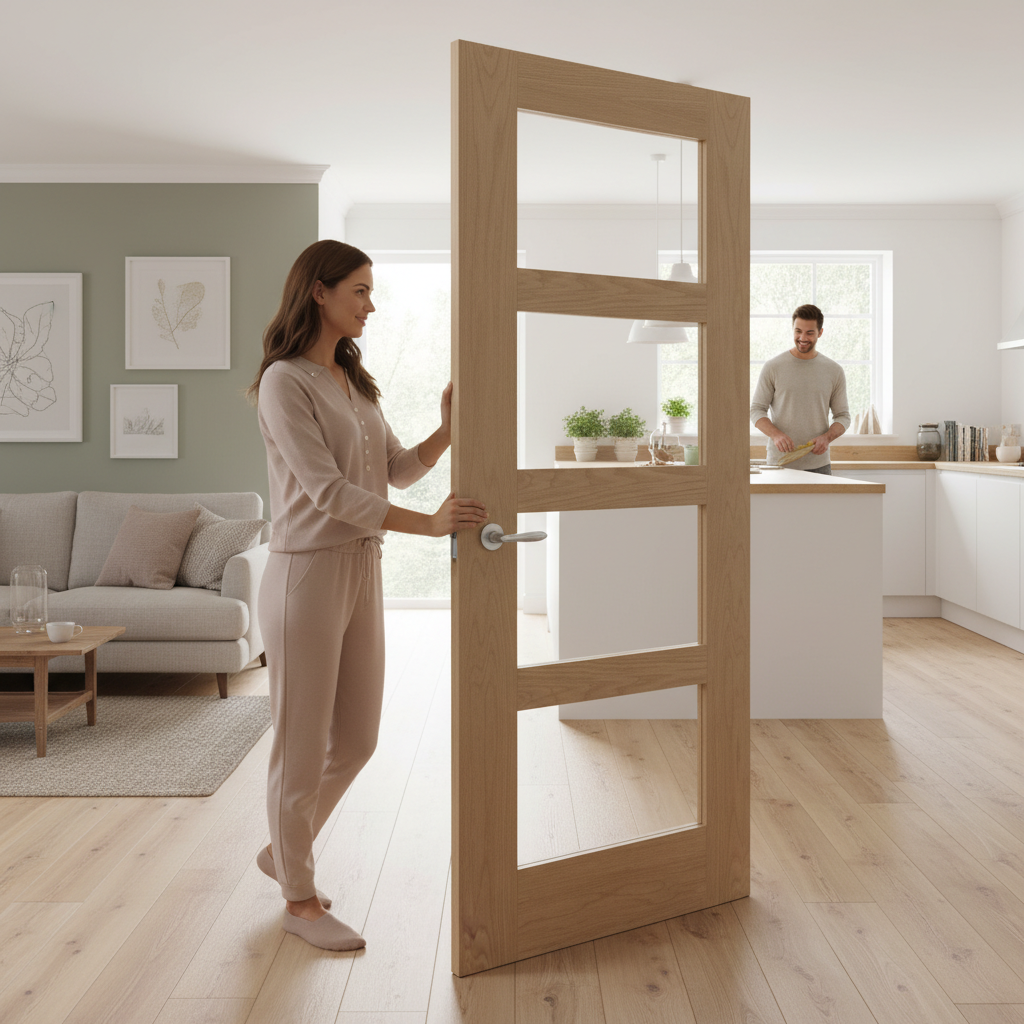 The Premium Internal Clear Glazed Oak Shaker Door seamlessly blends a traditional shaker style with transparent glass, making it a perfect fit for any home. The clear glass enhances natural light flow, bringing a bright and airy feeling to each room.