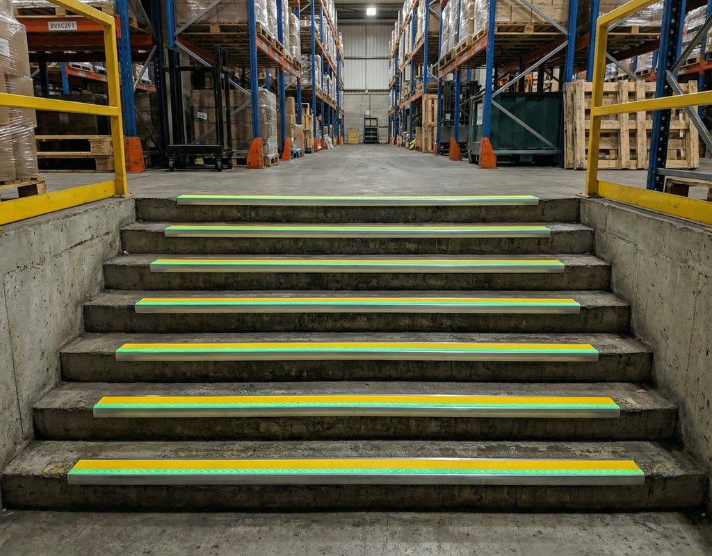 Distribution centres, manufacturing plants, and logistics facilities across the UK deploy our heavy-duty stair nosing to protect workers in environments where lighting failures pose significant safety risks. The robust aluminium construction withstands forklift traffic and intensive use.