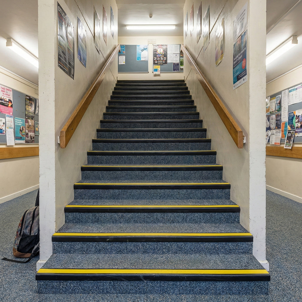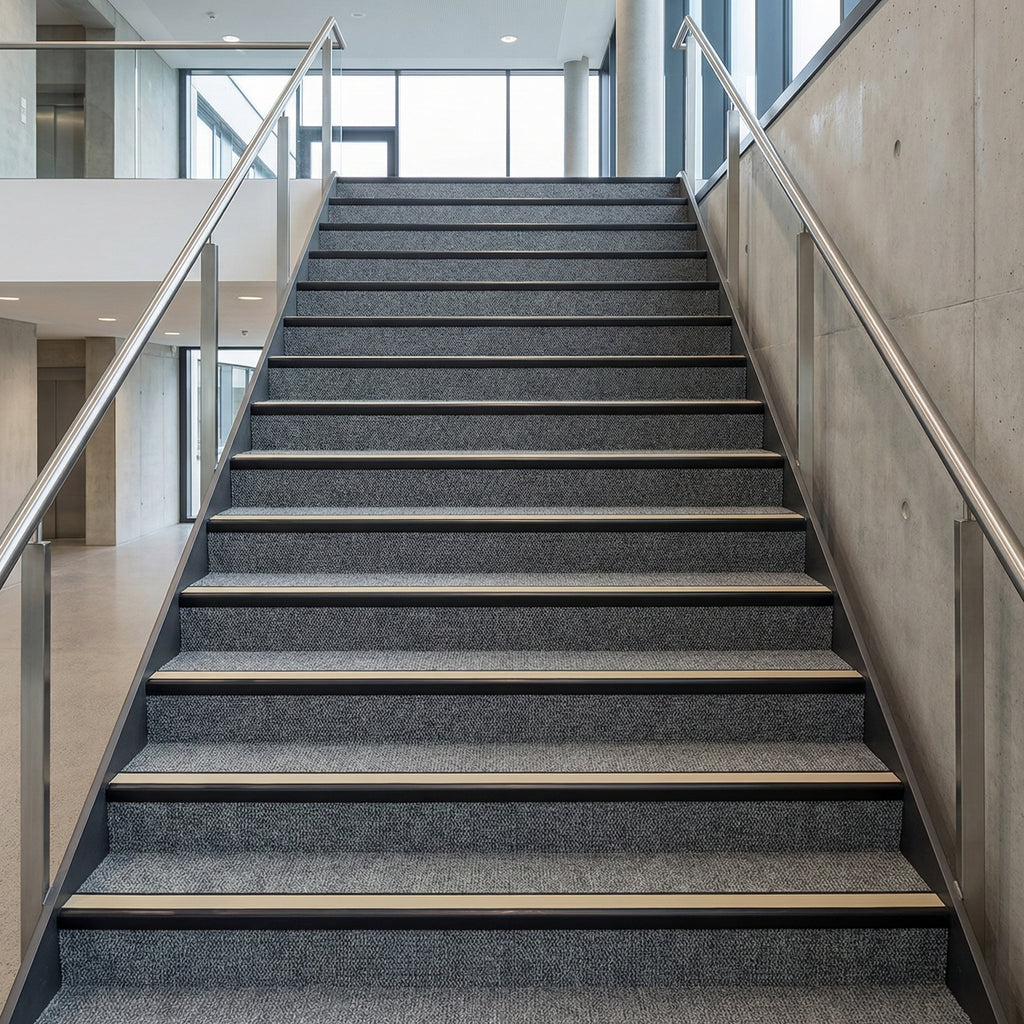 Provides critical edge definition and slip-resistant surface protection, reducing trip hazards and improving stair visibility in low-light conditions. Meets UK safety standards for commercial and public buildings throughout England, Scotland, Wales, and Northern Ireland.