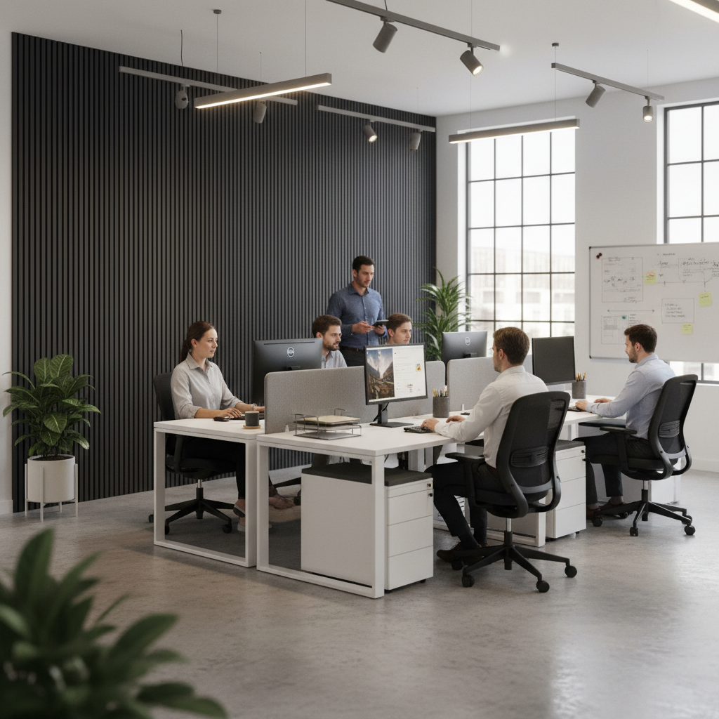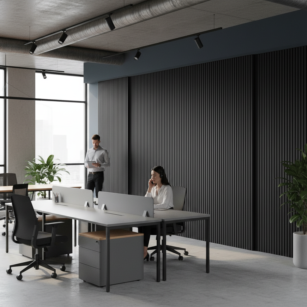 Transform your living or working space with the sleek and modern design of Premium Elevation Acoustic Wall Panelling. This panelling combines rich graphite black wood with premium felt backing, creating an elegant and functional solution for enhancing any interior. Not only does it deliver a contemporary aesthetic, but it also significantly improves room acoustics by dampening sound, providing a quieter and more comfortable environment.
