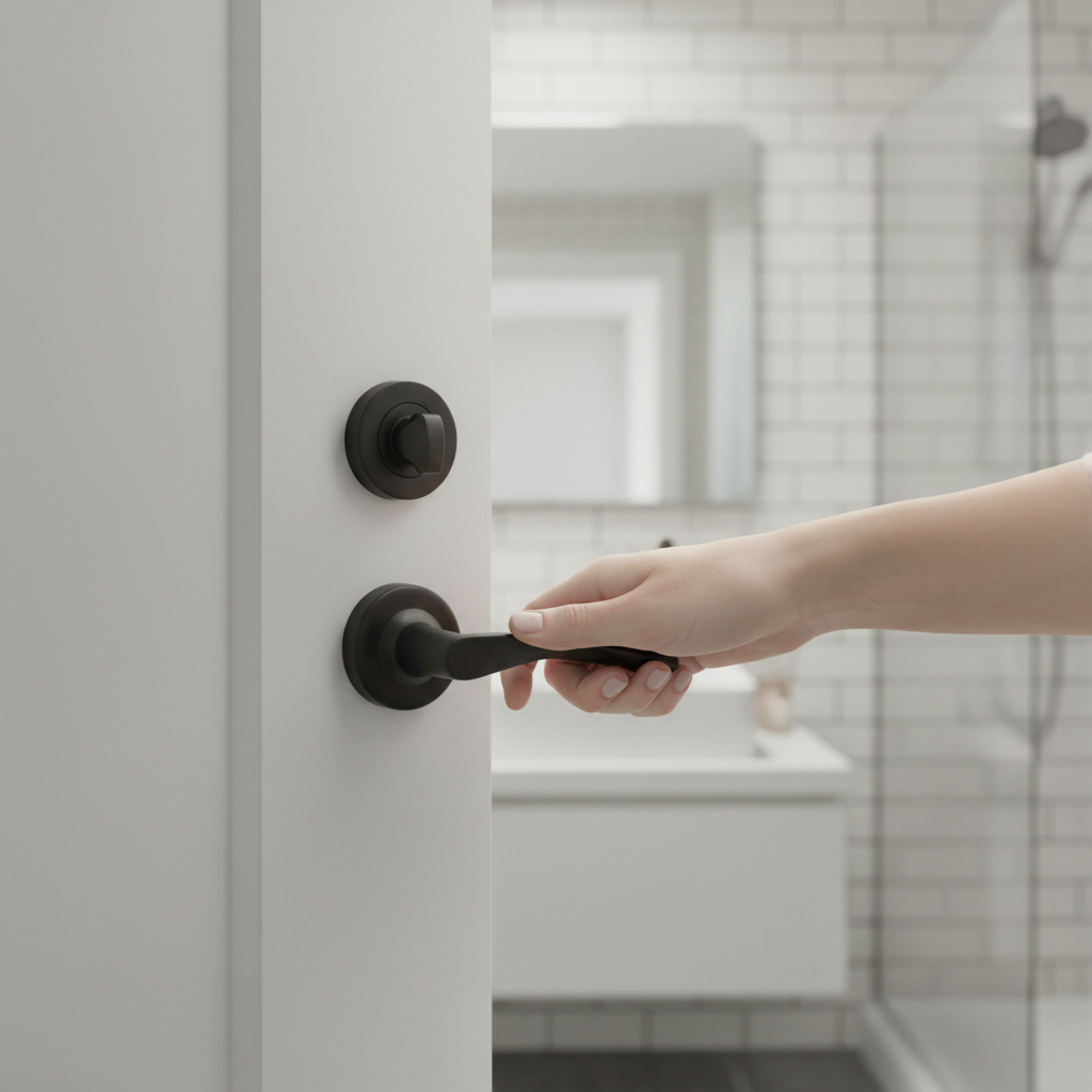 The Premium Internal Bathroom Lever Handle on Round Rose Pack offers a perfect blend of style and functionality. Designed for modern internal doors, this handle pack features a sleek matt black finish that complements contemporary home aesthetics. It is an ideal choice for bathroom doors, providing both elegance and privacy.