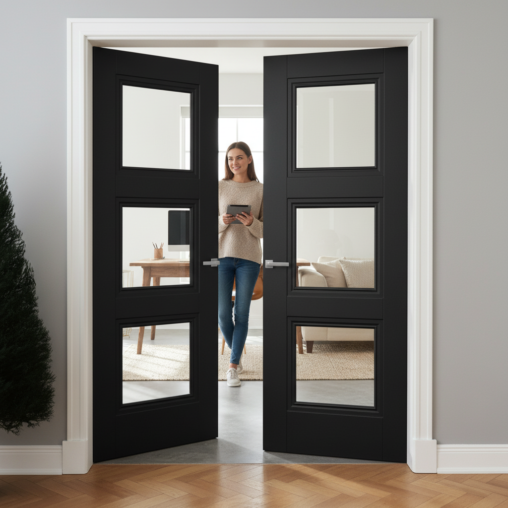 Internal Black Primed 3 Light Clear Glass Pair Door
