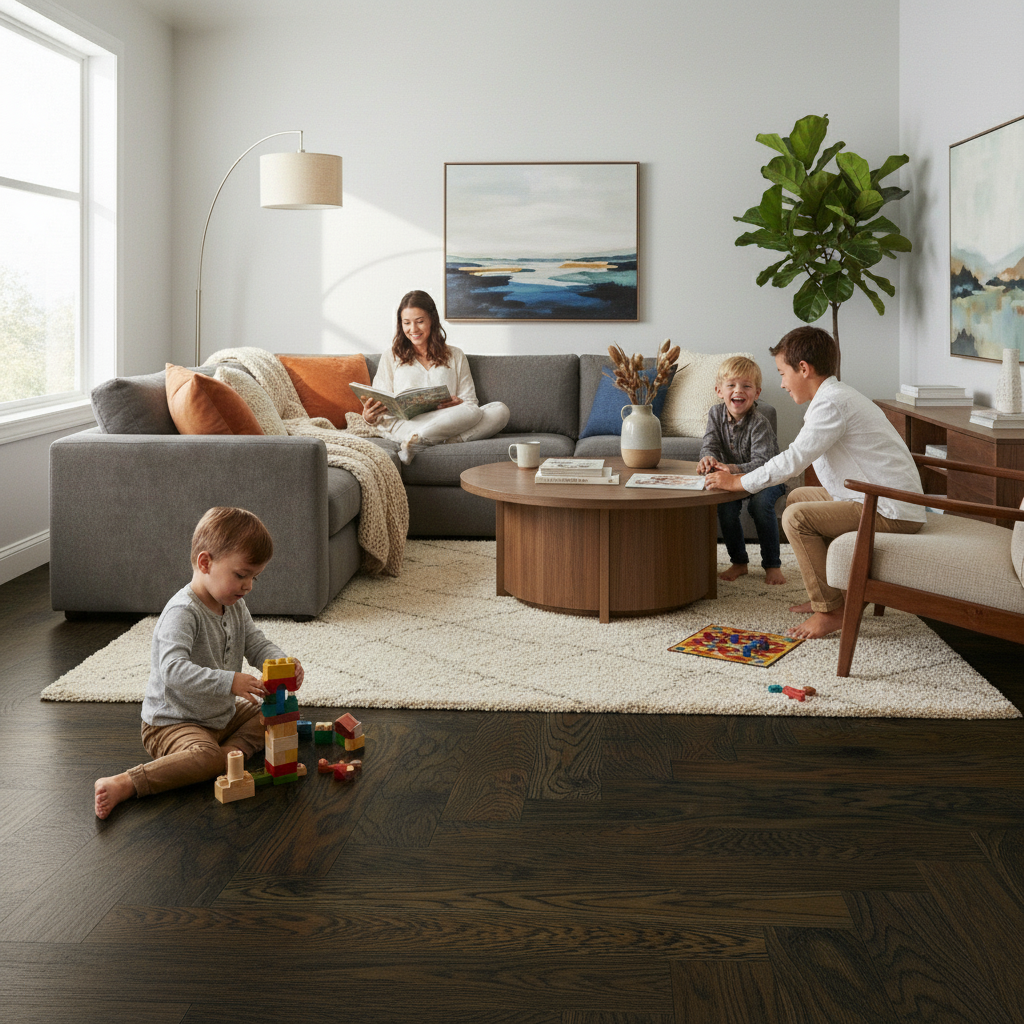 This premium herringbone solid real wood flooring is crafted from high-quality oak, featuring a stunning brushed UV lacquer finish that not only enhances its aesthetic appeal but also provides durability. The rich, dark tones of the herringbone pattern create a sophisticated ambiance in any interior space, making it an ideal choice for homeowners and designers alike.