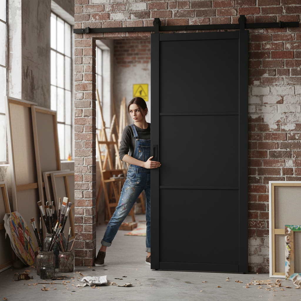 - Sophisticated Top Mounted Track: The matt black track enhances the door's industrial appeal and provides a smooth sliding experience.