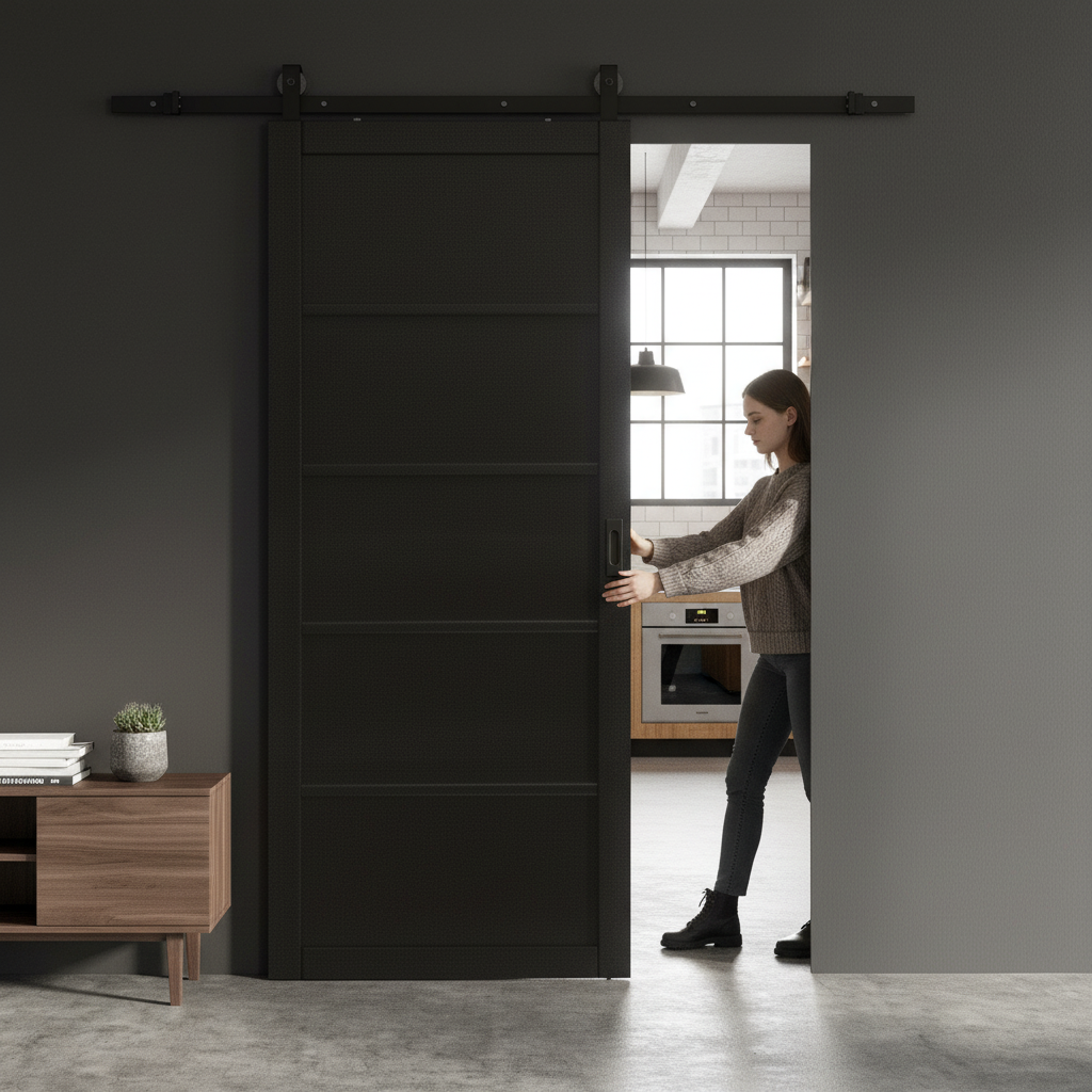 - Sleek Top Mounted Track: The matt black track provides a smooth sliding motion and adds to the door's overall industrial appeal.