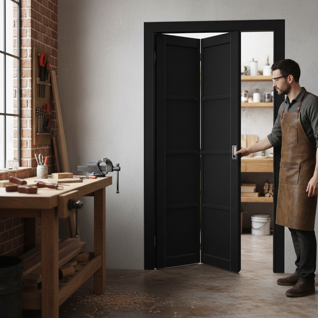 This Premium Internal Fully Finished 4 Panel Solid Bi-Fold Door is a stylish and functional addition to any modern interior. Featuring a sophisticated black finish and a classic four-panel design, this door offers the perfect blend of privacy and style, ideal for optimizing space in urban homes. The bi-fold mechanism allows for a compact folding action, making this door an excellent choice for separating spaces without sacrificing floor area.