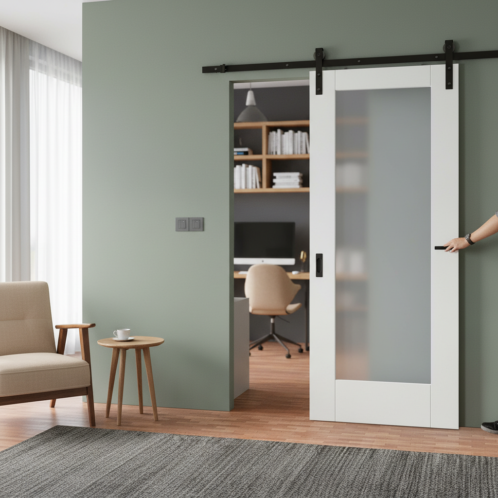 Introduce the simplicity and brightness of the Premium Internal Sliding Door Set to your home. This door set features a minimalist design with a large pane of obscure glass, allowing natural light to flood through and create an open, welcoming atmosphere. The door arrives pre-primed in white, providing a smooth canvas for you to customize with the paint color of your choice. A sleek black steel sliding track accompanies the door for a modern, space-saving installation.