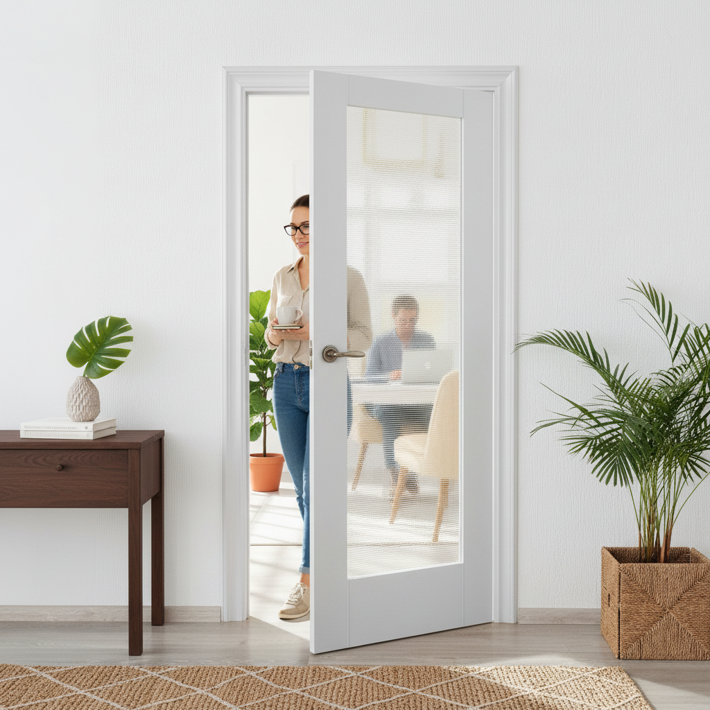 This premium internal white door is a perfect choice for modern interiors. It features a sleek design with a single glazed pane of 4mm obscure ocean glass, providing both style and privacy. The door is primed with a double coat, making it ready for your final finish, whether you prefer to keep it white or add your favorite color.