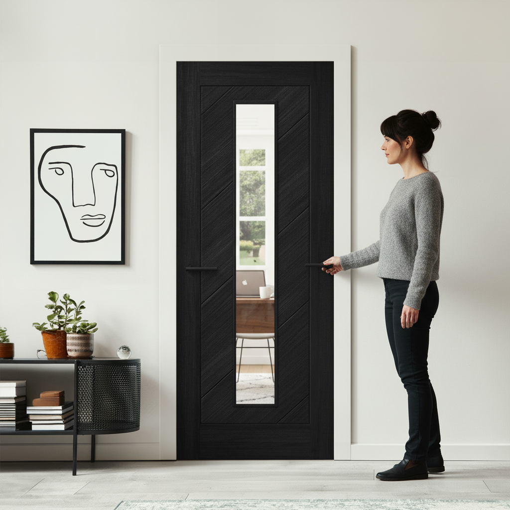 Constructed with a standard core, this door strikes the perfect balance between long-lasting durability and easy installation. The rich, black laminate finish not only offers a visually striking appearance but is also practical, providing a durable surface that's easy to care for. The clear glass panel enhances the door, allowing light to flow freely between rooms and creating a sense of openness. Designed with adaptability in mind, the door can be trimmed by up to 6mm on each edge to ensure an exact fit in a variety of spaces.