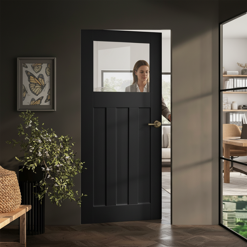 The Premium Internal Fully Finished Oak Clear Glass Made-to-Measure Door combines timeless elegance with modern functionality. Crafted from premium oak, this stylish door features a sleek black finish that adds a touch of sophistication to any interior space. The clear toughened safety glass panels enhance visual appeal while allowing natural light to flow freely between rooms, creating an inviting atmosphere.