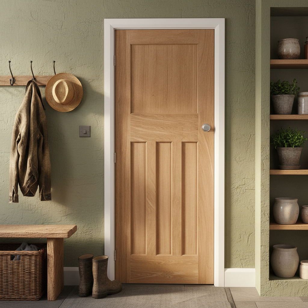 This Premium door features an American White Oak veneer, showcasing a 30's style design with three inset rectangular panels and an inset square panel. It presents various options including a Fire Door, Obscure Glazed Door, and Unglazed Door, allowing you to maintain a cohesive theme throughout your property.