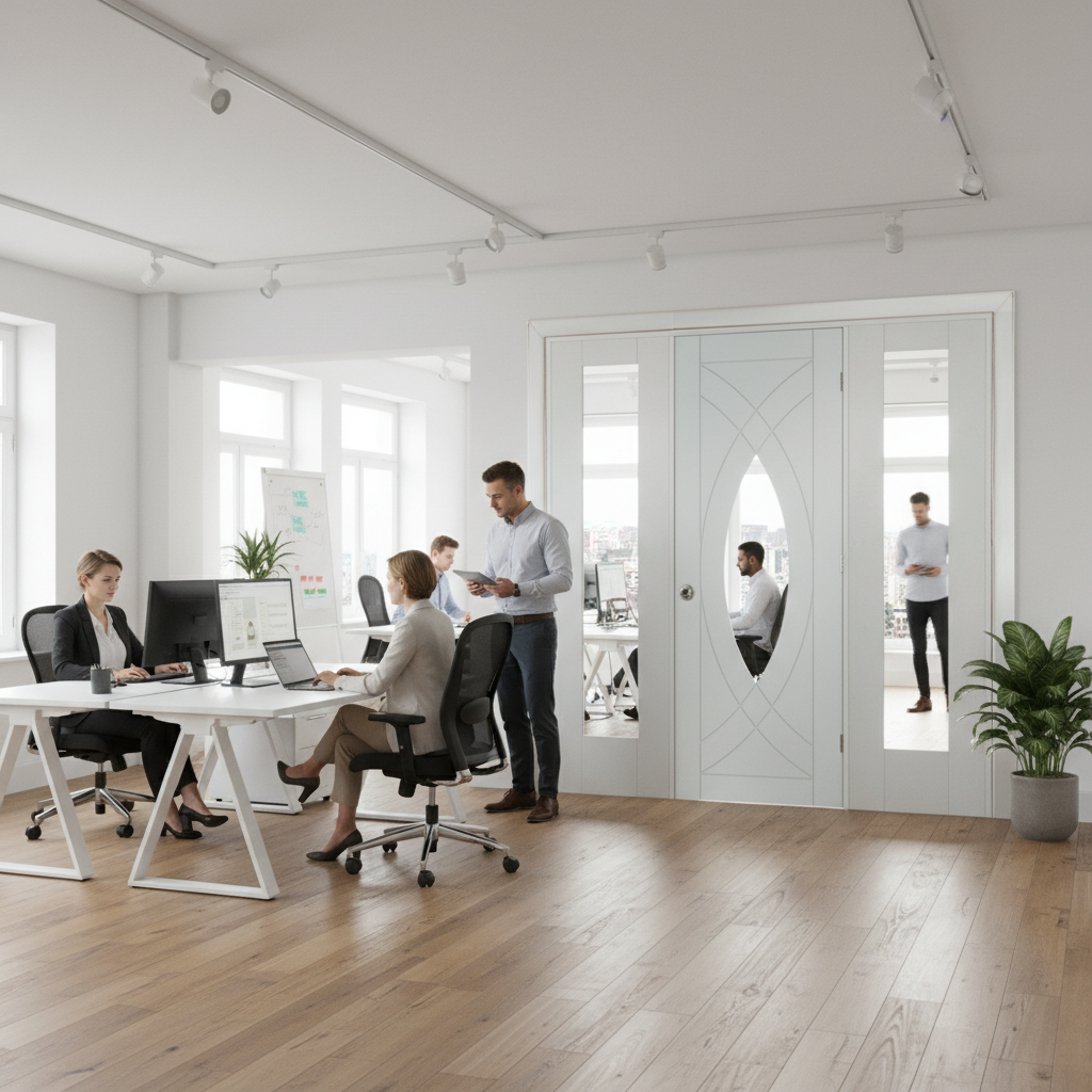 This stylish room divider adds creativity and flair to any space. It features a central glazed door with a clear glass panel and contemporary grooves, enhancing the aesthetic appeal of your room.