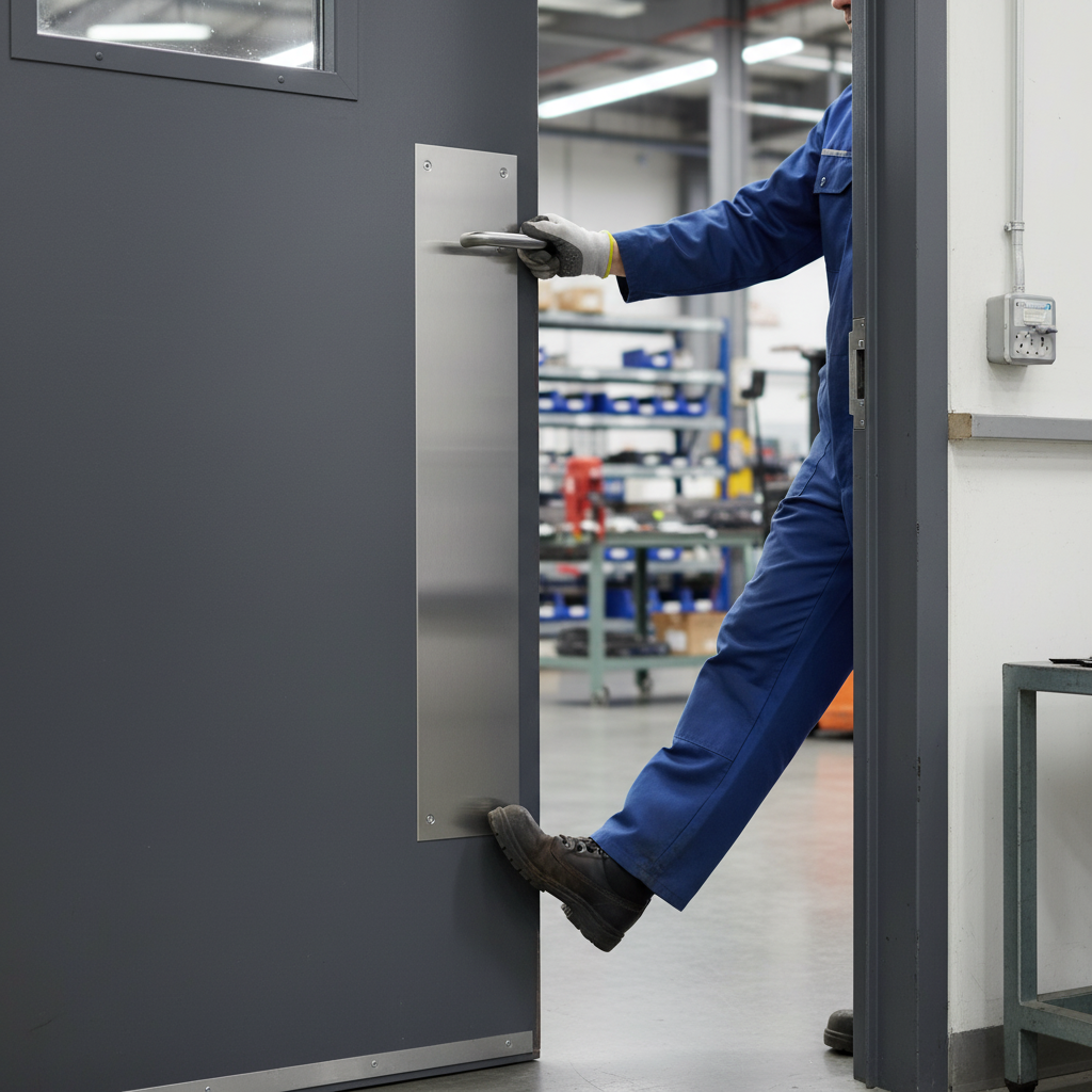 A kick plate protects the lower portion of doors from scuff marks and damage caused by foot traffic.
