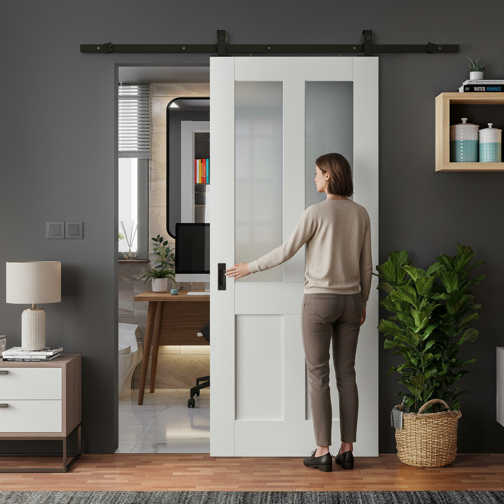 - What type of glass is used in the panels? The door features obscure glass for enhanced privacy while allowing light to filter through.