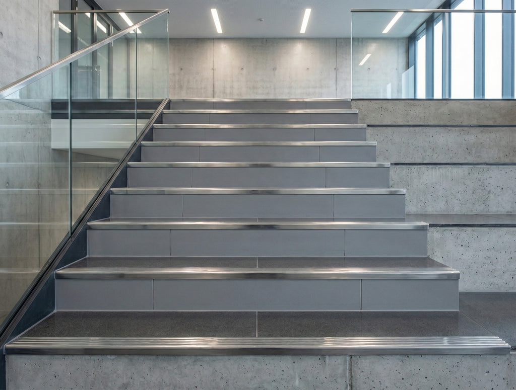 From heritage buildings in Scotland to modern commercial developments in England, our stainless steel stair nosing adapts to diverse architectural styles. The neutral metallic finish complements contemporary and traditional design schemes whilst providing essential edge protection.
